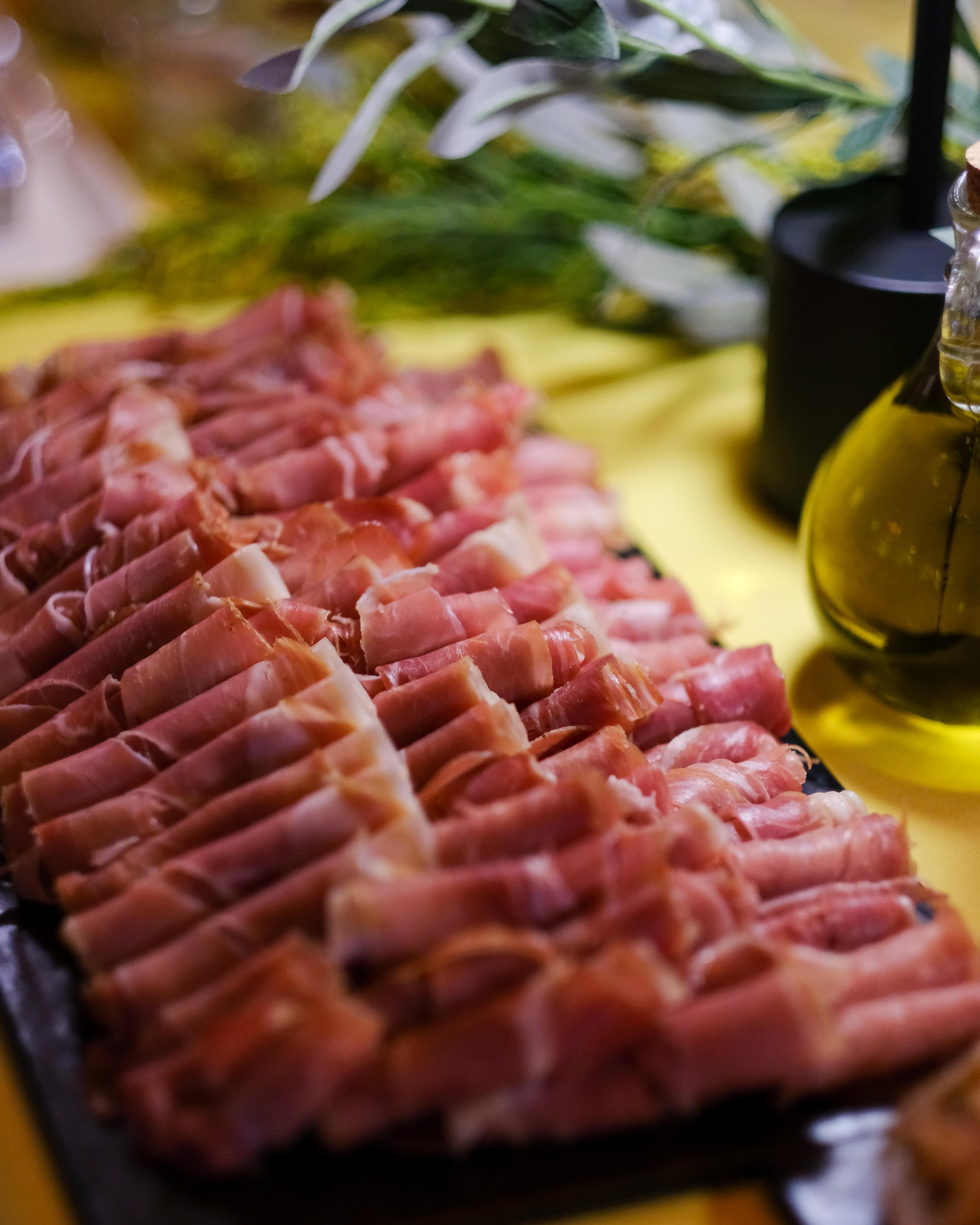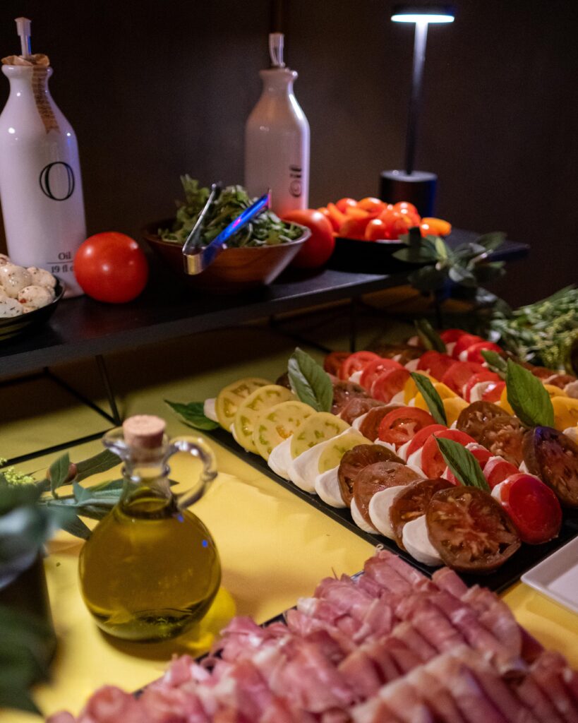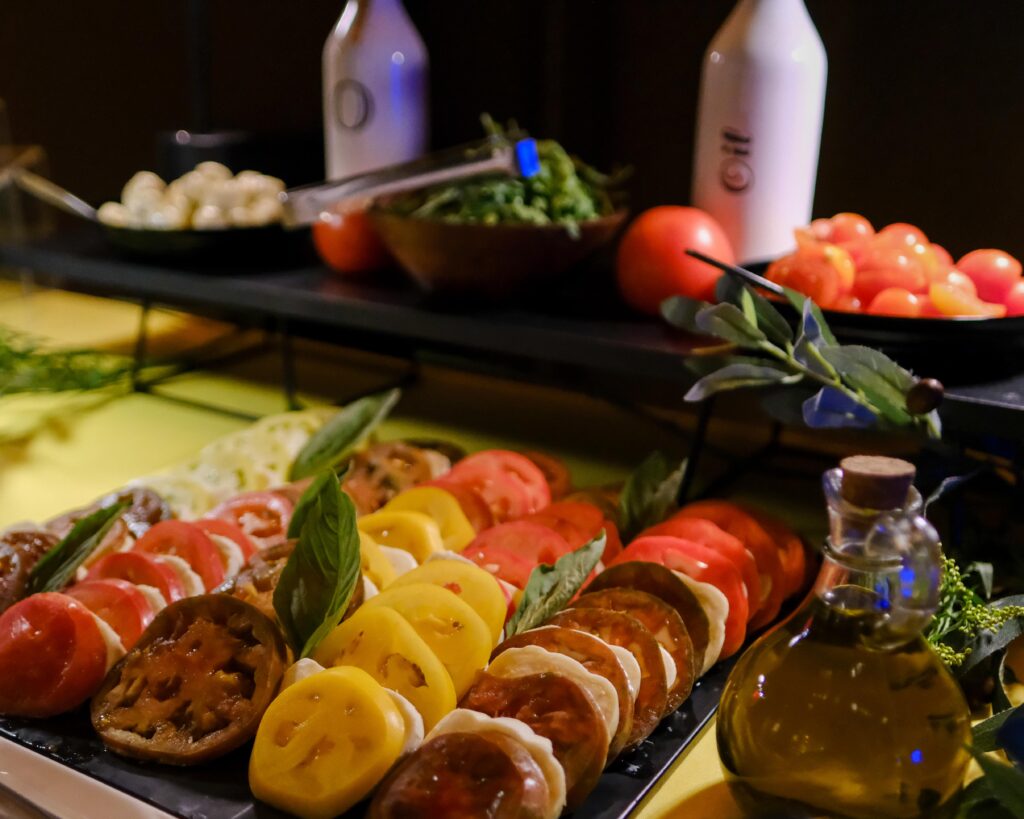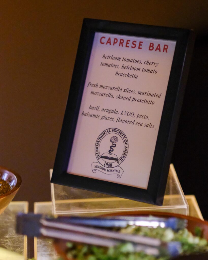 One of the evening’s most visually striking stations—and a guest favorite—was the Caprese Bar. Guests created their own small plates from a selection of heirloom and cherry tomatoes, fresh and marinated mozzarella, and delicate slices of prosciutto, with flavorful touches like pesto, balsamic glazes, basil, and artisan sea salts. It was a fresh, colorful complement to the heartier stations and a perfect pairing with the artful backdrop of the Chihuly Collection.